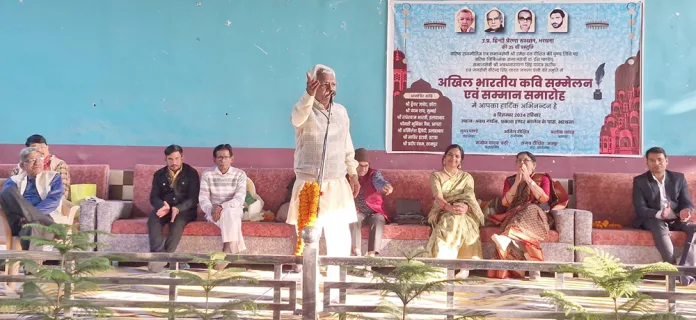 रविवार को कस्बा के जवाहर रोड स्थित अवध गार्डन में आयोजित अखिल भारतीय कवि सम्मेलन एवं सम्मान समारोह का शुभारम्भ माँ सरस्वती व दिवंगत समाजसेवियों के चित्र पर माल्यार्पण व दीप प्रज्जवलित करके किया गया। तदुपरान्त कवियत्री भूमिका जैन ने सरस्वती वन्दना पढकर ज्ञान की देवी का आवाहन करते हुए कवि सम्मेलन को गति प्रदान की। तदुपरान्त साबिर इटावी ने सब कुछ चला गया तेरी माँ के इलाज में, बेटी बता दहेज तेरा कैसे लाऊँ मैं पढकर विपरीत आर्थिक परिस्थितियों की तरफ ध्यान मोडा। प्रदीप पंचम ने मेरी ताकत मेरी कलम के खरीददार बहुत आये व अखिलेश द्विवेदी ने हम अपना दर्द बांटें या न बांटें पर हंसी बांटें पढी। वहीं गजलकार अशोक यादव ने मैंने कभी ईमान का सौदा नहीं किया तथा राधेश्याम भारती ने दो-दो बेटों की महतारी, अन्त समय में बाँझ हो गई पढकर वर्तमान में बिगडती पारिवारिक स्थितियों से रूबरू कराया। साथ ही गीतकार चन्दन राय ने मैंने कदमों पे दिल बिछाया है, चल के जा औ कुचल के न जाओ पढकर तालियां बटोरीं।