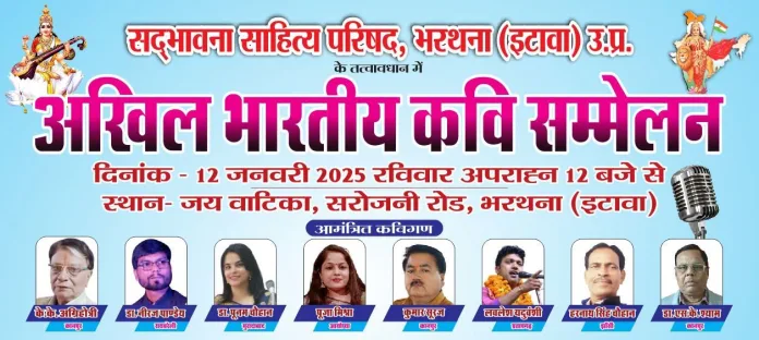 भरथना (रिपोर्ट- तनुज श्रीवास्तव, 9720063658)- सद्भावना साहित्य परिषद भरथना के तत्वाधान में आगामी 12 जनवरी 2025 दिन रविवार को अपरान्ह्र 12 बजे से कस्बा के सरोजनी रोड स्थित जय वाटिका में अखिल भारतीय कवि सम्मेलन का आयोजन किया जायेगा।