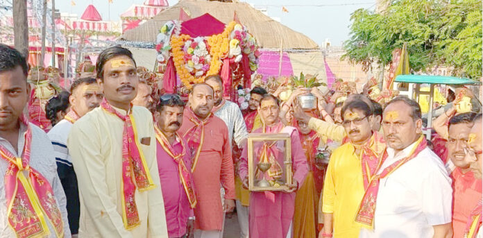 शारदीय नवरात्रि के पावन पर्व पर श्री नवदुर्गा पूजा समिति (रजि0) भरथना के तत्वाधान् में विगत वर्षों की भाँति इस वर्ष भी सोमवार की सांय नगर भ्रमण को निकली मंगल कलश यात्रा के साथ 29वें श्री नवदुर्गा पूजा महोत्सव का भव्य शुभारम्भ हो गया। कस्बा के मुहल्ला मोतीगंज स्थित राजाराम पोरवाल पीतल वालों के हाता से बैण्ड बाजों की समधुर ध्वनियों के बीच नगर भ्रमण को निकली मंगल कलश यात्रा में सम्मिलित पीताम्बर पहने महिलाओं-युवतियों ने सिर पर कलश रखकर नगर के प्रमुख मार्गों मोतीगंज, तिलक रोड, बजाजा लाइन चौराहा, होमगंज, सरोजनी रोड, जवाहर रोड आदि के देवस्थानों के दर्शन व जल भरकर पुनः महोत्सव प्रांगण में आचार्य राहुल दीक्षित द्वारा वैदिक मंत्रोच्चारण के बीच कलशों की स्थापना करवायी गई। तदुपरान्त सांय उच्च सिंहासन पर विराजमान माँ भगवती के भव्य स्वरूप के दर्शन भक्तों को कराये गये। साथ ही संगीतमयी ध्वनियों पर सम्पन्न होने वाली पंच आरतियों का गायन कर श्रद्धालु महिला-पुरूष भक्तजनों ने सामूहिक रूप से अपने आराध्य का आवाहन कर जगतजननी माँ दुर्गा के गगनभेदी उद्घोषों से समूचा पाण्डाल गुंजायमान कर दिया। कलश यात्रा के दौरान बृजेश गुप्ता रूपे, श्रीकृष्ण पोरवाल, हरिओम दुबे, समिति अध्यक्ष संजीव दीक्षित गपूडे, महामंत्री भरत पोरवाल, कोषाध्यक्ष श्याम पोरवाल, विपिन पोरवाल छोटे, सोनू मिश्रा डीलर, नेक्से पोरवाल, प्रशान्त अवस्थी, रोहित गुप्ता, छेदीलाल कश्यप आदि की उपस्थिति उल्लेखनीय रही।