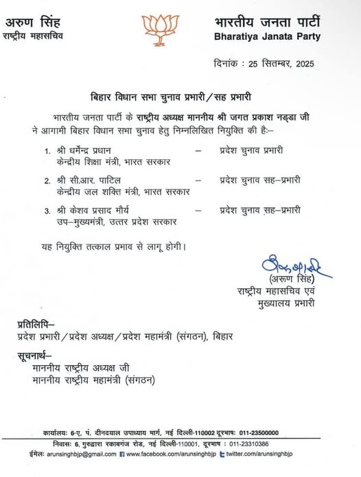 बिहार विधानसभा चुनाव के लिए केंद्रीय नेतृत्व द्वारा केंद्रीय शिक्षा मंत्री धर्मेन्द्र प्रधान को प्रदेश चुनाव प्रभारी, केंद्रीय जल शक्ति मंत्री सी.आर. पाटिल और उत्तर प्रदेश के उप-मुख्यमंत्री केशव प्रसाद मौर्य को प्रदेश सह प्रभारी नियुक्त किए जाने पर सदर विधायक ने उन्हें हार्दिक बधाई और शुभकामनाएं दी हैं।