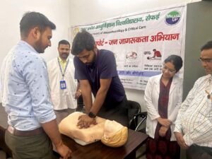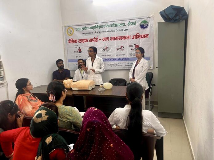यूपीयूएमएस सैफई के एनेस्थीसियोलॉजी विभाग ने सीएचसी सैफई में जीवन रक्षक कौशल के लिए एक व्यावहारिक प्रशिक्षण सत्र आयोजित किया। इस सत्र का उद्देश्य आम जनता और स्वास्थ्य कर्मचारियों को आवश्यक बुनियादी जीवन रक्षक तकनीकों से परिचित कराना और उन्हें आपातकालीन परिस्थितियों में तुरंत कार्रवाई करने के लिए तैयार करना था।