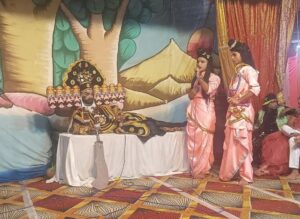मंच पर भगवान राम, लक्ष्मण और हनुमान का आगमन हुआ, जिसके बाद रावण युद्ध भूमि में पहुंचा। राम और रावण के बीच भयंकर युद्ध का मंचन किया गया। युद्ध के दौरान राम ने कई बार रावण के सिर काटे, लेकिन वे फिर से जुड़ जाते थे। तब रावण के भाई विभीषण ने राम को बताया कि रावण की नाभि में अमृत है। भगवान राम ने दिव्य बाण से रावण की नाभि पर वार कर उसका अंत कर दिया।