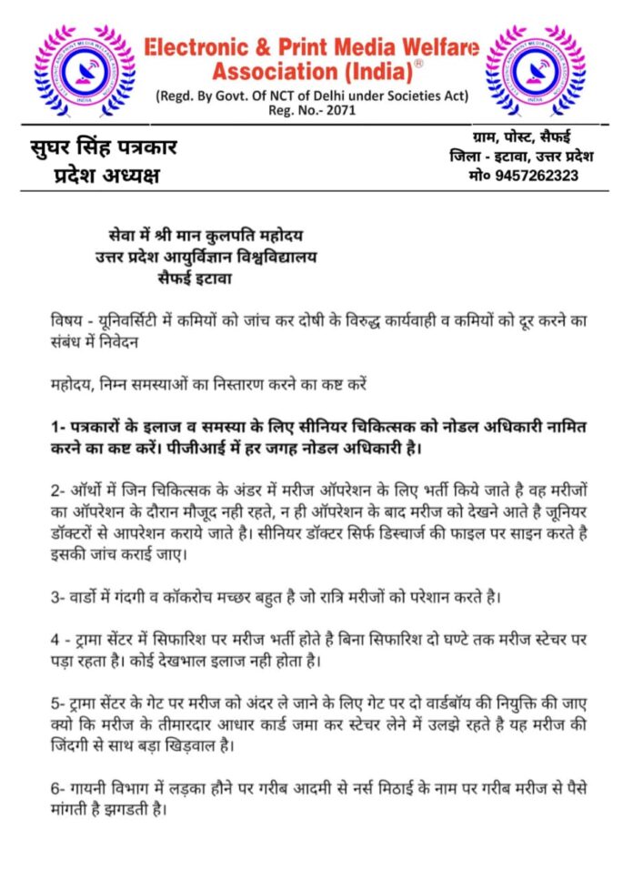 सैफई मेडिकल यूनिवर्सिटी में अब पत्रकारों और उनके परिजनों के इलाज एवं सुविधाओं से जुड़ी समस्याओं के समाधान के लिए एक नोडल अधिकारी की नियुक्ति की गई है।
