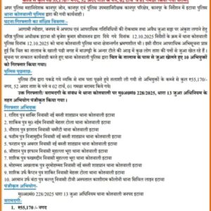 पुलिस टीम ने छापेमारी कर जुआ खेल रहे 10 अभियुक्तों को मौके से गिरफ्तार किया। तलाशी के दौरान उनके कब्जे से ₹55,170 नगद, 52 अदद ताश के पत्ते, 02 टॉर्च तथा 01 गमछा बरामद किया गया।