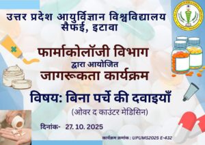 उत्तर प्रदेश यूनिवर्सिटी ऑफ मेडिकल साइंसेज (यूपीयूएमएस), सैफई के फार्माकोलॉजी विभाग द्वारा 27 अक्तूबर 2025 को सामुदायिक स्वास्थ्य केंद्र, सैफई में मरीजों एवं आमजन के लिए “ओवर-द-काउंटर (OTC) दवाओं” पर जनजागरूकता कार्यक्रम आयोजित किया गया।