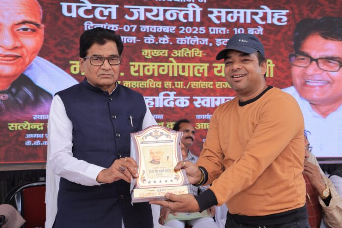 जनपद इटावा के के.के. डिग्री कॉलेज में सरदार पटेल जयंती 2025 के अवसर पर उत्तर प्रदेश सरदार पटेल विचार मंच के तत्वाधान में भव्य समारोह का आयोजन किया गया। समारोह में मुख्य अतिथि के रूप में पधारे समाजवादी पार्टी के राष्ट्रीय महासचिव प्रो. (डॉ.) रामगोपाल यादव ने विभिन्न क्षेत्रों में उत्कृष्ट योगदान देने वाली विभूतियों को सम्मानित किया।