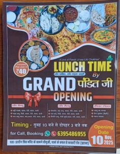 शहर के मुहल्ला चौगुर्जी में आज ‘पंडित जी लिट्टी चोखा वाले’ के नए प्रतिष्ठान ‘लंच टाइम बाय पंडित जी’ का भव्य शुभारंभ हुआ। यह नया भोजनालय देवकी नंदन चौगुर्जी पार्क के बगल में स्थित है।