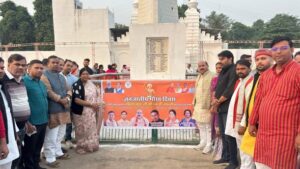 राष्ट्र और संस्कृति के लिए सर्वस्व समर्पण करने वाले महान स्वतंत्रता सेनानी भगवान बिरसा मुंडा की 150वीं जयंती के अवसर पर नुमाइश ग्राउंड स्थित शहीद स्मारक पर श्रद्धांजलि समारोह आयोजित किया गया।