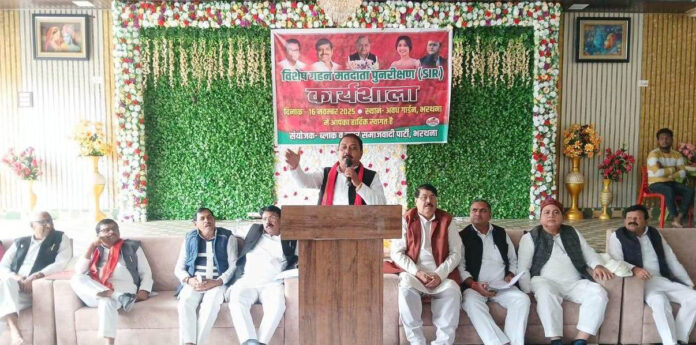 कस्बा के जवाहर रोड स्थित अवध गार्डन में रविवार को समाजवादी पार्टी के राष्ट्रीय आवाहन पर ब्लाक व नगर स्तरीय विशेष गहन मतदाता पुनरीक्षण (एसआईआर) कार्यशाला जिलाध्यक्ष प्रदीप शाक्य की अध्यक्षता में सम्पन्न हुई। कार्यशाला को बतौर मुख्य अतिथि सम्बोधित करते हुए सांसद जितेन्द्र दोहरे ने भाजपा सरकार पर करारा प्रहार करते हुए कहा कि एसआईआर पीडीए को खत्म करने की सोची समझी साजिश है। इसलिए सभी पार्टी पदाधिकारी व कार्यकर्ता, बूथ अध्यक्ष, प्रभारी, बीएलए समेत मतदाता एसआईआर को गम्भीरता से लें। अगर आप किन्हीं कारणवश अपना एसआईआर फार्म भरकर जमा नहीं कर सके, तो आप मतदाताधिकार का प्रयोग करने से वंचित रहेगें। वहीं कार्यशाला को विधायक प्रदीप यादव, विधायक राघवेन्द्र गौतम, पूर्व मंत्री श्रीकृष्ण यादव, पूर्व मंत्री अशोक यादव, पूर्व ब्लाक प्रमुख हरिओम यादव, पूर्व चैयरमैन फुरकान अहमद, पूर्व जि0पं0स0 मनोज यादव बण्टी, जिला महासचिव वीरभान सिंह भदौरिया (वीरू), अजय यादव, प्रदेश सचिव अनीता दिवाकर ने भी अपने-अपने उद्बोधन के माध्यम से अधिक से अधिक एसआईआर फार्म भरकर जमा कराने की पुरजोर अपील की।