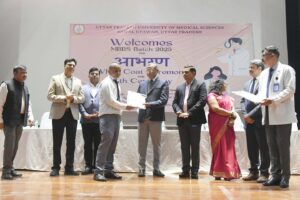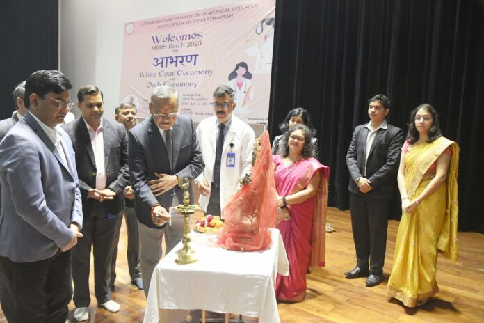 उत्तर प्रदेश आयुर्विज्ञान विश्वविद्यालय (यूपीयूएमएस) में एमबीबीएस 2025–26 बैच की प्रतिष्ठित ‘White Coat Ceremony’ गरिमामय वातावरण में सफलतापूर्वक आयोजित की गई। समारोह में नव-प्रवेशित विद्यार्थियों ने सम्मान, जिम्मेदारी और मानव सेवा के प्रतीक सफेद कोट को धारण करते हुए चिकित्सा पेशे में प्रवेश का पहला औपचारिक कदम रखा।