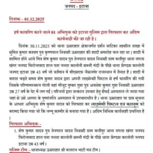 एसएसपी इटावा ने इस त्वरित व प्रभावी कार्रवाई के लिए पुलिस टीम की सराहना की और कहा कि जनपद में हर्ष फायरिंग जैसी खतरनाक प्रवृत्तियों को किसी भी स्थिति में बर्दाश्त नहीं किया जाएगा। उन्होंने सभी थाना प्रभारियों को ऐसे मामलों पर कड़ी निगरानी रखने के निर्देश भी दिए।
