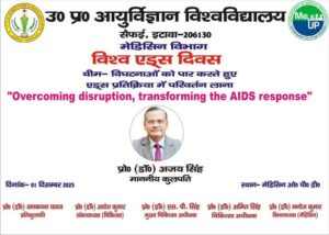 यूपीयूएमएस, सैफई के जनरल मेडिसिन विभाग द्वारा ओपीडी परिसर में विश्व एड्स दिवस के अवसर पर एक जागरूकता कार्यक्रम आयोजित किया गया। कार्यक्रम का उद्देश्य एचआईवी/एड्स के प्रति जागरूकता बढ़ाना, मिथकों को दूर करना और समाज में वैज्ञानिक दृष्टिकोण को बढ़ावा देना रहा। इस वर्ष विश्व एड्स दिवस की थीम थी — “बाधाओं को पार करते हुए, एड्स प्रतिक्रिया में बदलाव लाना”।