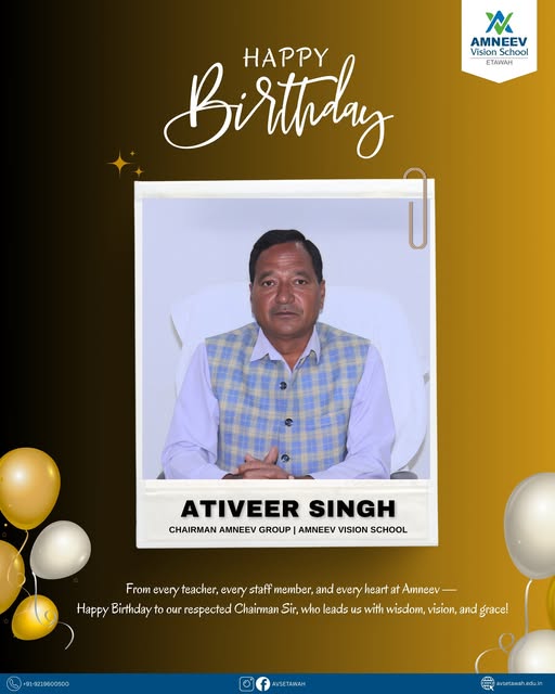 एमनीव विज़न स्कूल के चेयरमैन अतीवीर सिंह के जन्मदिन के अवसर पर इटावालाइव की ओर से उन्हें हार्दिक शुभकामनाएँ प्रेषित की गईं। इस खास दिन पर विद्यालय परिवार और शुभचिंतकों ने उनके दीर्घायु, उत्तम स्वास्थ्य और निरंतर प्रगति की कामना की।