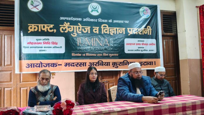 अल्पसंख्यक अधिकार दिवस के अवसर पर शहर के प्रतिष्ठित शिक्षण संस्थान मदरसा अरबिया क़ुरानिया, इटावा में क्राफ्ट, लैंग्वेज एवं विज्ञान प्रदर्शनी का भव्य आयोजन किया गया। कार्यक्रम का उद्घाटन जिला अल्पसंख्यक कल्याण अधिकारी निधि सिंह ने फीता काटकर किया। इस अवसर पर मदरसा परिवार के सदस्य, बड़ी संख्या में छात्र-छात्राएं, अभिभावक तथा गणमान्य नागरिक उपस्थित रहे।