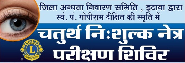 भरथना (रिपोर्ट- तनुज श्रीवास्तव, 9720063658)- जिला अन्धता निवारण समिति इटावा द्वारा स्व0 गोपीराम दीक्षित की स्मृति में चतुर्थ निःशुल्क नेत्र परीक्षण शिविर का आयोजन 20 दिसम्बर दिन शनिवार को प्रातः 10 बजे से अपरान्ह्र 3 बजे तक कस्बा के मुहल्ला मन्दिर दानसहाय स्थित गोपीराम दीक्षित राइस मिल में आयोजित किया जायेगा।