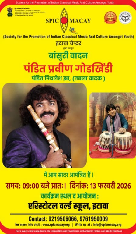 इटावा, 12 फरवरी। देशव्यापी सांस्कृतिक आंदोलन से जुड़ी प्रतिष्ठित संस्था स्पिक मैके (सोसायटी फॉर द प्रमोशन ऑफ इंडियन क्लासिकल म्यूजिक एंड कल्चर अमॉन्ग्स्ट यूथ) इटावा जनपद में जिलाधिकारी शुभ्रांशु शुक्ला की प्रेरणा से अपने नए चैप्टर की शुरुआत करने जा रही है। इस ऐतिहासिक पहल के तहत विश्व विख्यात बांसुरी वादक पंडित प्रवीण गोडखिंडी जिले के तीन विद्यालयों में अपनी प्रस्तुतियां देंगे। इस अवसर पर स्पिक मैके के राष्ट्रीय अध्यक्ष राधा मोहन तिवारी विशेष रूप से उपस्थित रहेंगे।