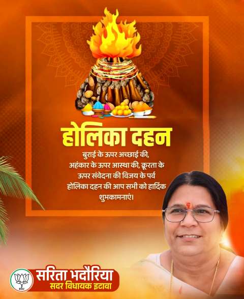 विधायक सरिता भदौरिया ने समस्त देश एवं प्रदेशवासियों को होलिका दहन के पावन, मंगलमय एवं पवित्र पर्व की हार्दिक बधाई एवं शुभकामनाएं दी हैं।