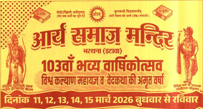 भरथना (रिपोर्ट- तनुज श्रीवास्तव, 9720063658)- आर्य समाज मन्दिर भरथना का 103वाँ भव्य वार्षिकोत्सव के उपलक्ष्य में विश्व कल्याण महायज्ञ एवं वेदकथा की अमृत वर्षा का पाँच दिवसीय कार्यक्रम आगामी 11 मार्च से 15 मार्च तक आर्य समाज मन्दिर भरथना पर सम्पन्न होगा।