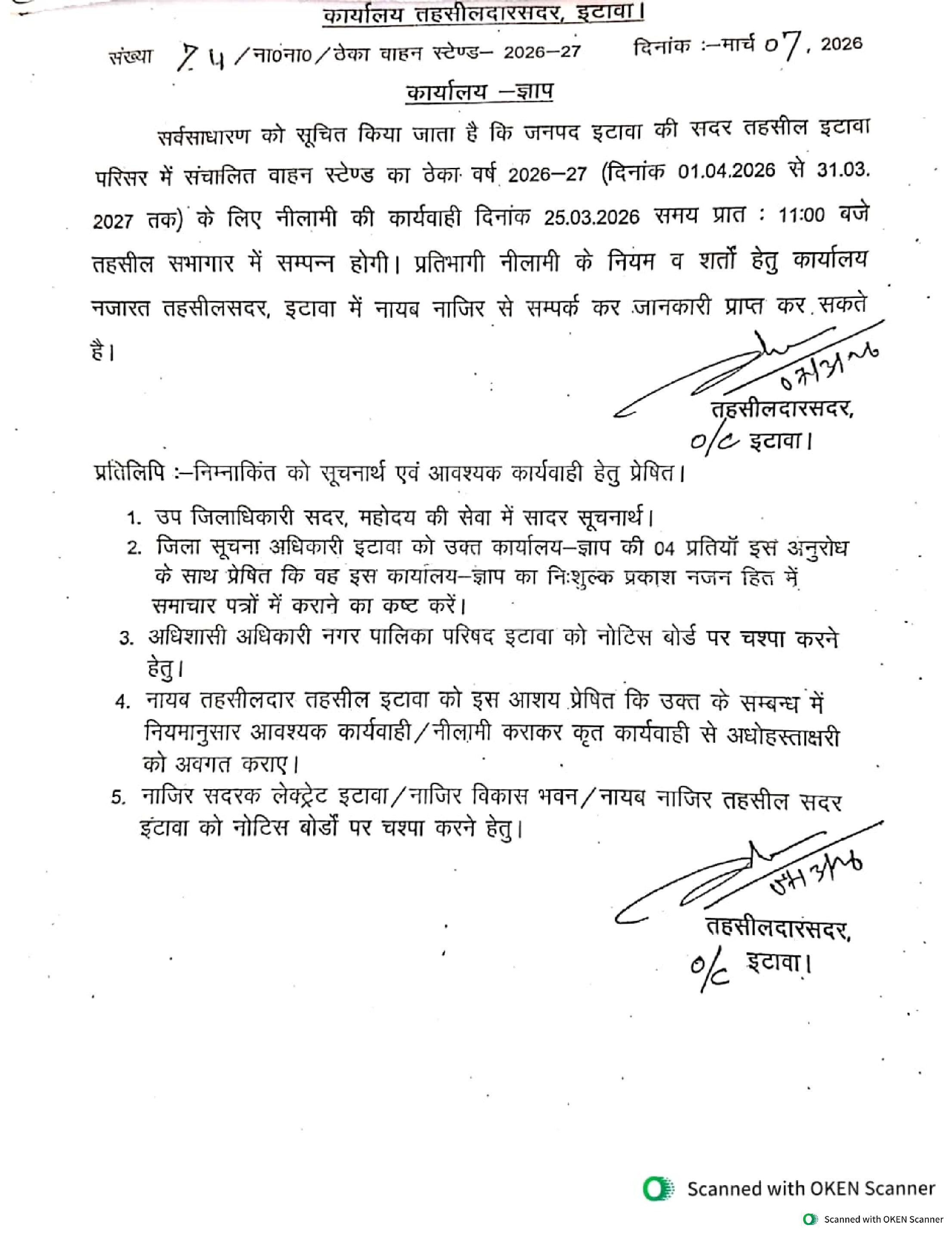 तहसीलदार सदर द्वारा सर्वसाधारण को सूचित किया गया है कि जनपद इटावा की सदर तहसील परिसर में संचालित वाहन स्टैंड का ठेका वर्ष 2026-27 के लिए नीलामी के माध्यम से दिया जाएगा।