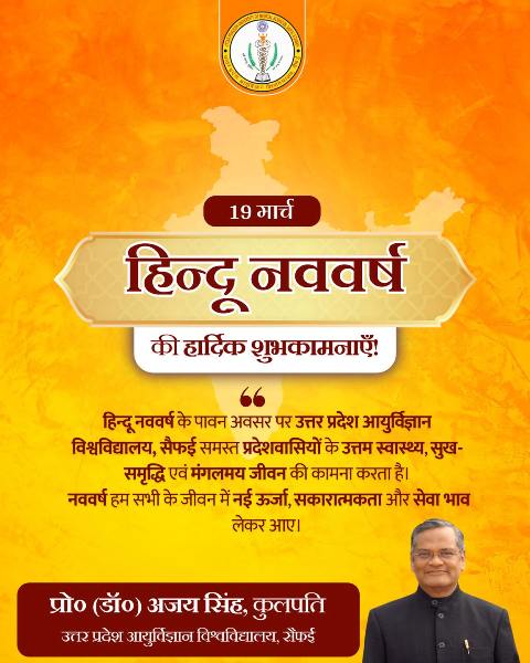 नव संवत्सर के पावन अवसर पर उत्तर प्रदेश आयुर्विज्ञान विश्वविद्यालय (यूपीयूएमएस), सैफई की ओर से सभी प्रदेशवासियों को हिन्दू नववर्ष की हार्दिक बधाई एवं शुभकामनाएं दी गई हैं।